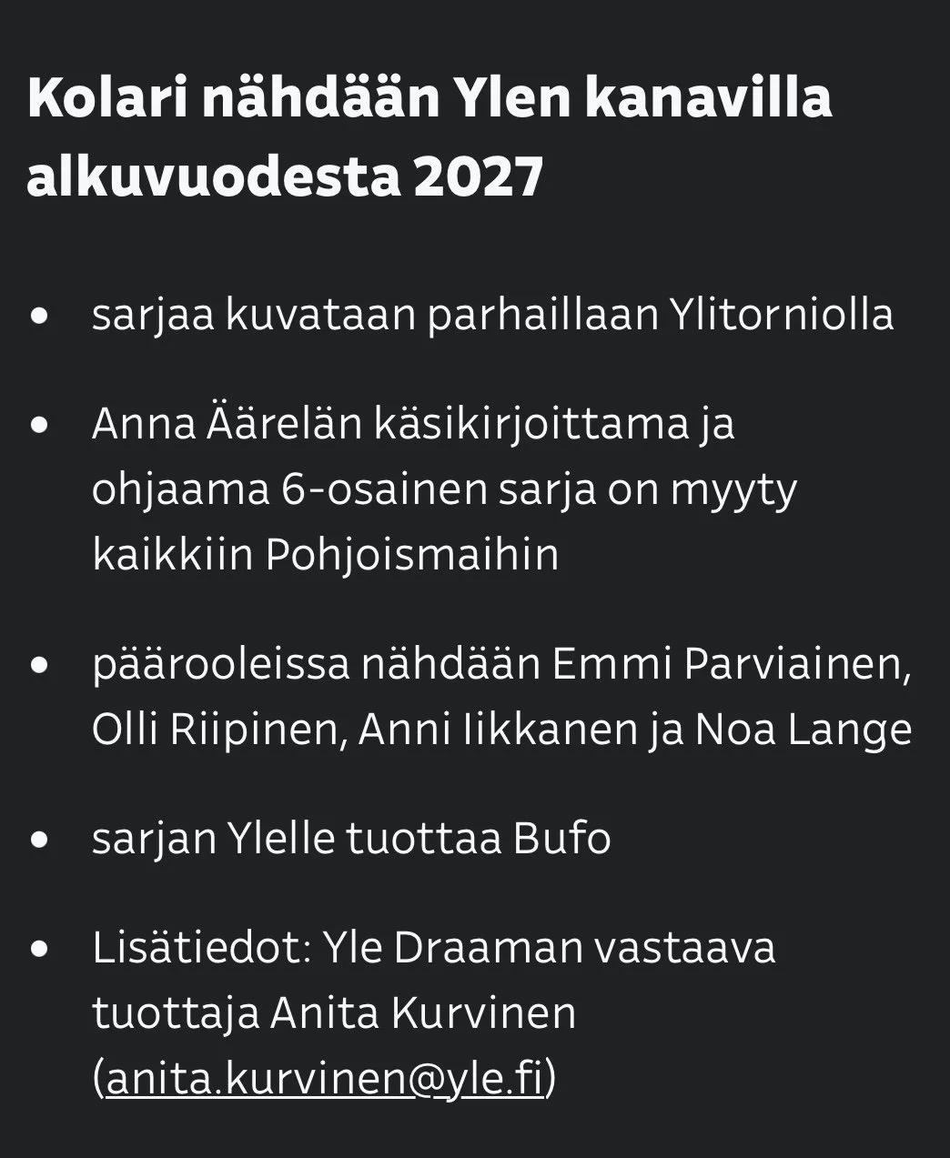 tv-tuotannot tulossa… 2027kolari TUPA 13 Rooli: kettunenIlmestyy: toukokuu 2025Katso: yle areenaIT’S ALIVE FILMS pohjoisen tähti kausi 2 Rooli: roniIlmestynyt: maaliskuu 2025Katso: yle areenaYELLOW FILM & TV SAVELA kausi 2 Rooli: PössyIlmestynyt: Maaliskuu 2024Katso: Yle AreenaSolar Films UTÖ Rooli: SebastianIlmestynyt: Tammikuu 2024Katso: Ruutu PlusLucy Loves Drama savela kausi 1 Rooli: PössyIlmestynyt: Marraskuu 2022Katso: Yle AreenaSolar Films häräntappoase Rooli: pasi rutanenIlmestynyt: kesäkuu 2021Katso: ruutuwelhofilm & legendafilm